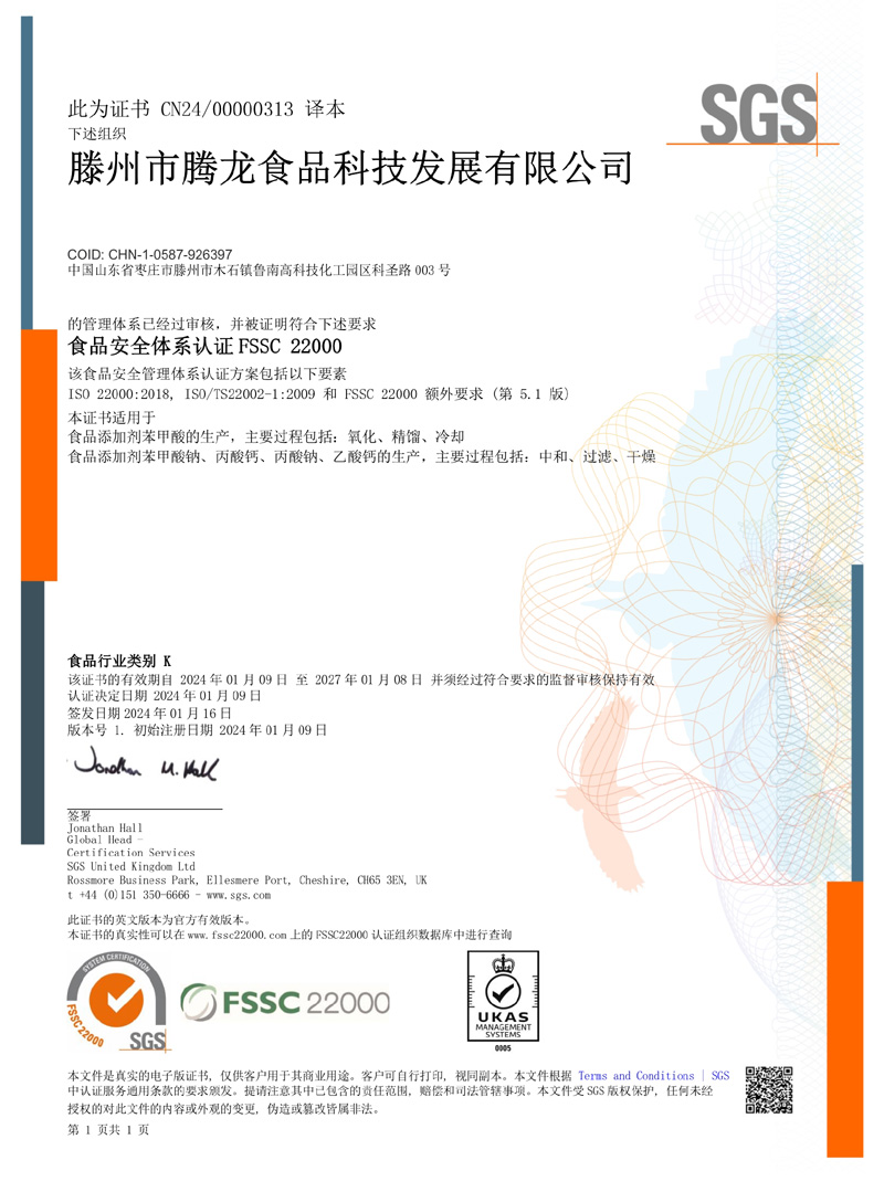 滕州市騰龍食品科技發展有限公司坐落在山東省滕州市木石鎮魯南高科技化工園區,成立于1996年,前身是滕州市騰龍化工有限責任公司,公司專業生產 苯甲酸,苯甲酸鈉,丙酸鈣,丙酸鈉和醋酸鈣等系列產品。